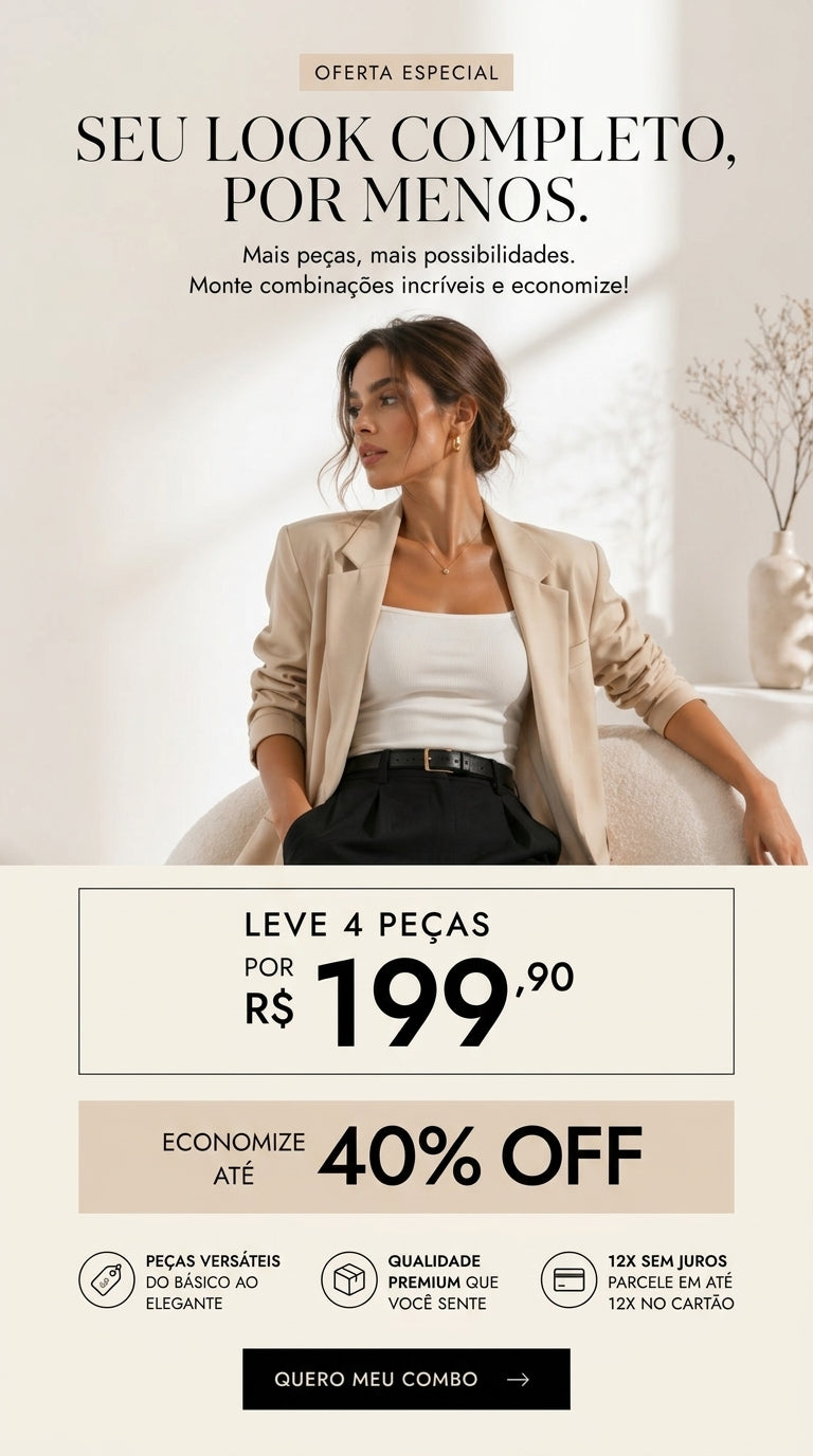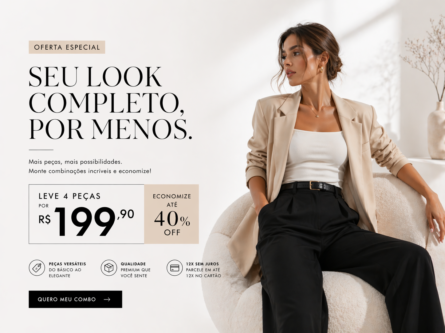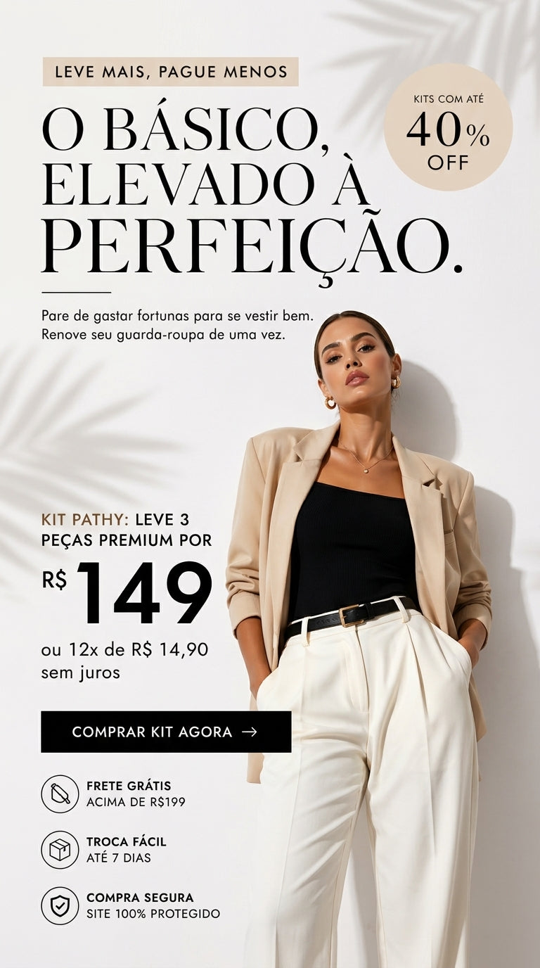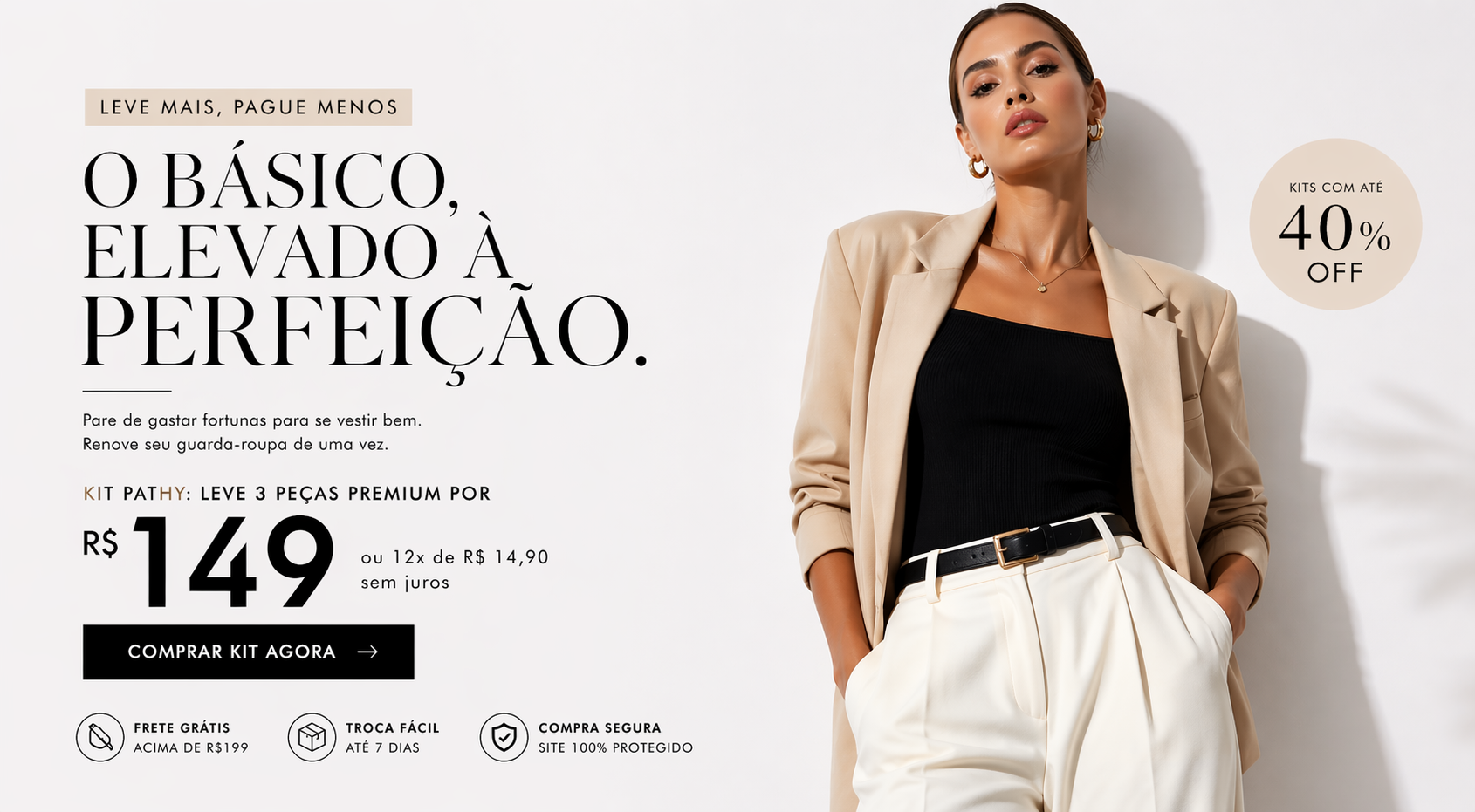 Em vez de cobrar preços absurdos por peças avulsas, focamos na criação de Kits Essenciais: roupas com tecidos premium, modelagem sofisticada e caimento perfeito para todas as medidas (do P ao 2XL).